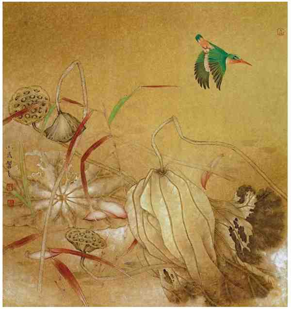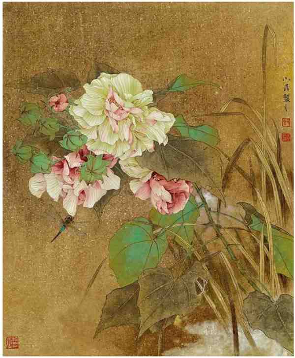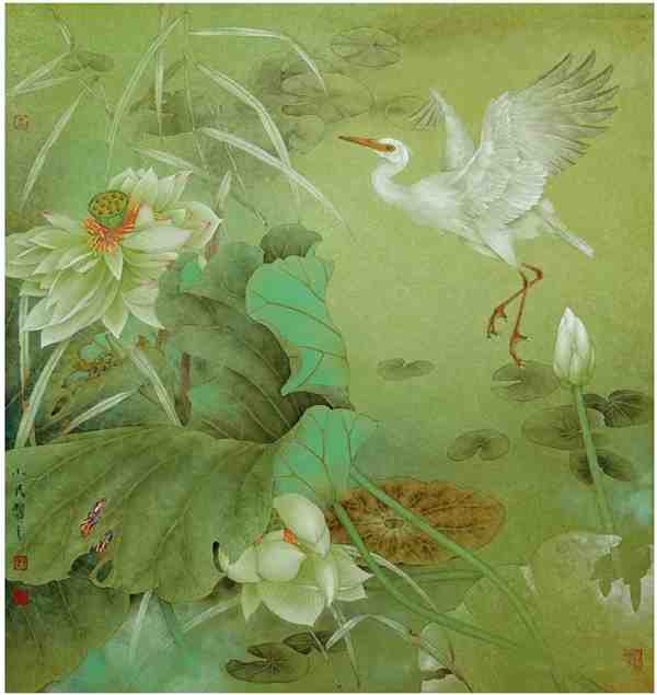 在工笔花鸟画中,画家通过白描造型、勾勒填彩,再采用分染、罩染、统染、点染、接染、撞水、碰色等技法描绘对象,产生栩栩如生、精致动人的视觉效果。