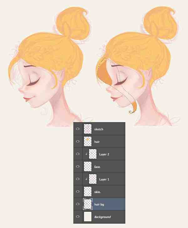 首先我们要有一张人物的草稿图,然后再在上面创建一个新的头发图层,根据草图用套索工具(L)拉出大致形状,用柔和的黄色填充创建区域,画出一个麦金色的圆发髻。