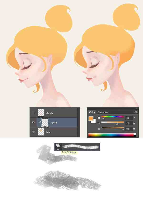 再次切换到[软油彩蜡笔]笔刷,创建另一个剪切蒙版图层,链接到“Hair”图层。使填充色略深于头发的基色调,在女孩的头后面添加一个柔和的阴影,让它更显饱满、立体。继续画头发,添加暗面的阴影和光面的亮色。降低笔刷大小,缩小到极细的笔触,分别绘制各处发丝的效果。