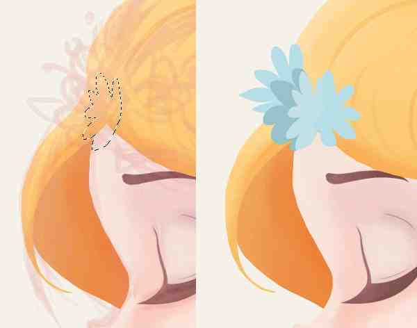 让我们制作花环的部分,开始勾画我们的第一朵花。为这朵花创建一个新的图层,使用 套索工具(L),然后使用几片花瓣来组成一个简单的花朵的形状,这部分不需要十分对称、或者过于复杂—你只需要画一个随意的曲线形状。然后用浅蓝色填充路径。再多添加几朵花,为每一朵都单独创建新的图层,填充不同颜色的饱和度和亮度。