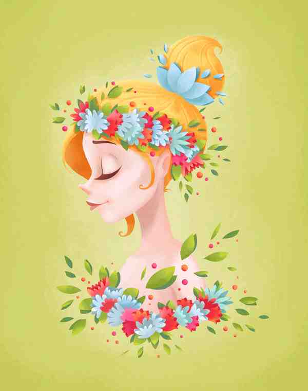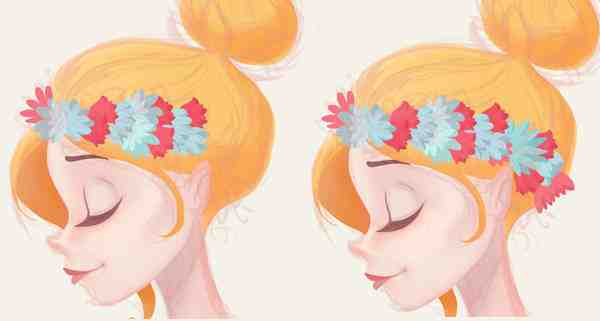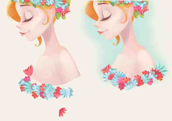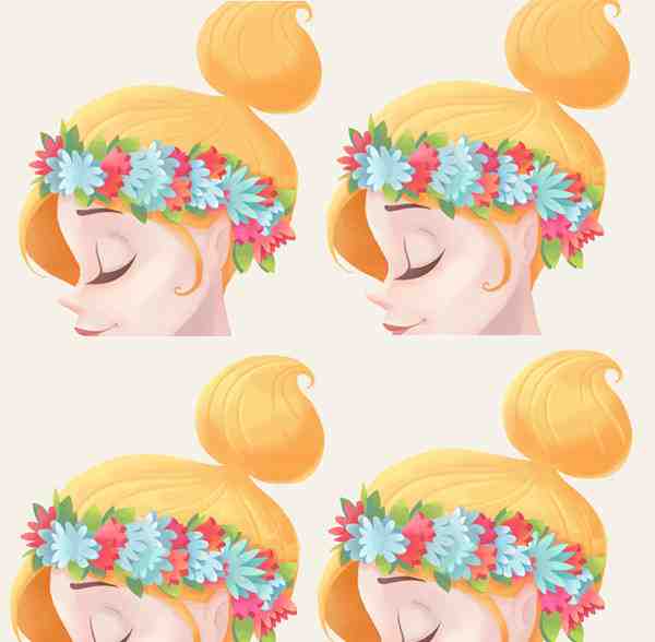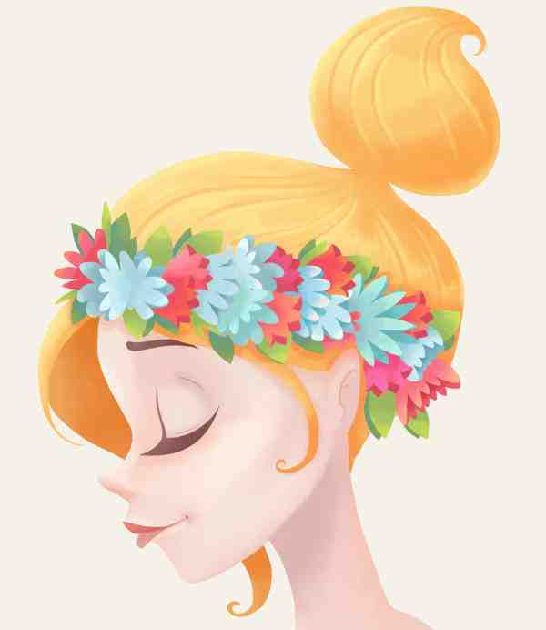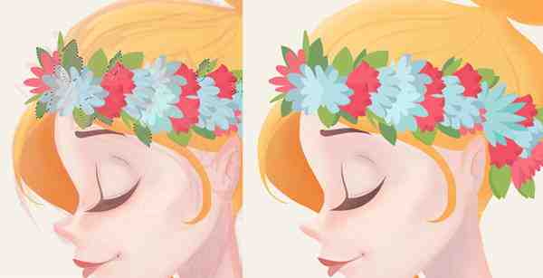 添加一个亮粉色的郁金香,让我们为最前列的花朵重新着色,这样花朵的色彩交替,花环显得更繁茂。选择花朵图层,在图层面板中找到一个格子图案的锁图标,它可以锁定透明像素。这是另一种可以保证在形状里上色不超出边缘的方法。用亮粉色在花朵上绘制,改变它的颜色。画更多的花朵,使花环更精致。选取相关图层和按control-j,复制刚才创建的花朵副本,使它们互相重叠。为花环添加更多元素,使它完全围住头部。你可以选择所有花朵图层,为它们创建一个组(CTRL-G),以保持图层面板整洁。