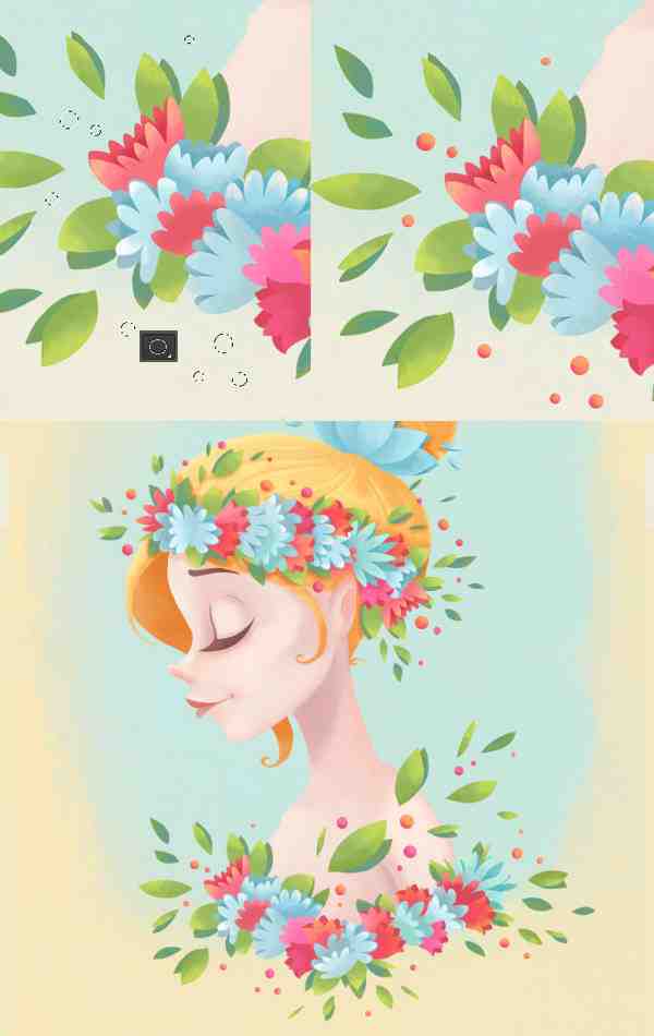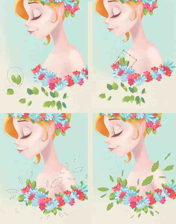 从头部的花圈开始复制树叶图层,使用套索工具(L)一个一个的选择树叶,并使用Ctrl+T对其进行自由变换。移动树叶到合适的位置,将我们放在女孩胸部位置的花的后面,在叶子周围画一些虚线让我们看上去被风吹动。画出小一些的叶子,用深绿色填充。在女孩头部周围加一些相似的叶子状点,让画面看起来更生动。