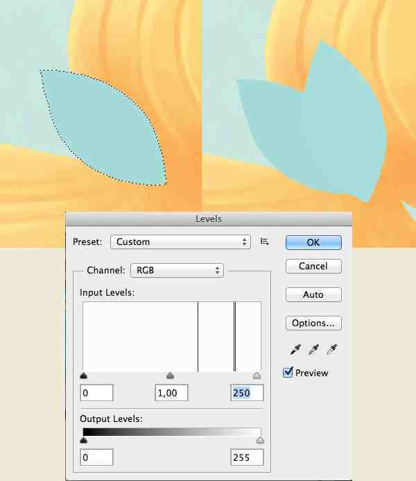 让我们继续我们草图里面描绘的下一个细节:一个优雅的花苞头。使用套索工具开始形成一个蓝色的花瓣,重复花瓣,改变它的位置。保持新的花瓣的选中状态,打开色阶属性面板(Ctrl+L),移动右侧滑块(白色的)向左一点点,让花瓣的颜色更亮。