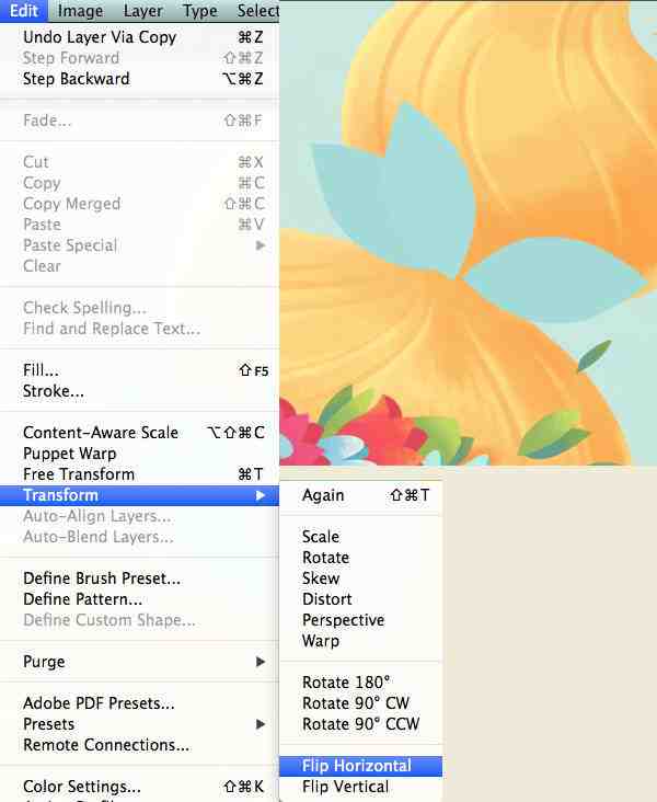 重复最初的花瓣,通过编辑>变换>水平翻转,在垂直轴上创造一个镜面的副本。移动镜像的花瓣到发苞的另一边。