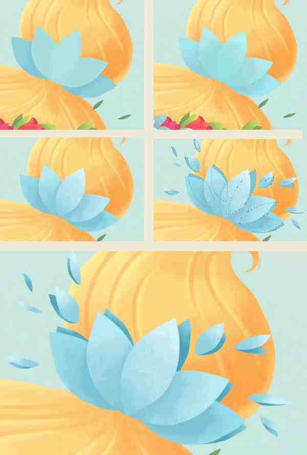 复制并形成更多花瓣,构成一个对称的莲花。选取画笔工具(B),选取[软油彩蜡笔]笔刷在头发上方的花瓣上添加轻微的斑点,添加几组从莲花向外散射的细小花瓣组。在下面添加深色花瓣,塑造光影效果,使花瓣更加立体。