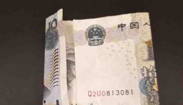 步骤6.接下来我们开始折10元的,将中间10的1和0对折,把多余的部分对折回来,和50元的差不多。
