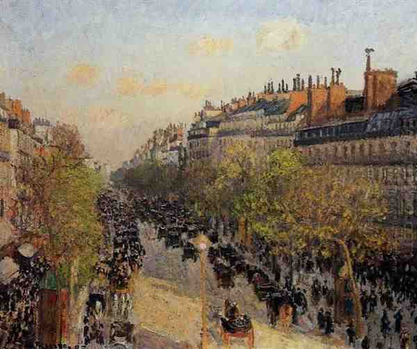 是法国印象派大师卡米耶·毕沙罗于1897年创作的一幅油画名作,现收藏在俄罗斯圣彼得堡埃尔米塔日博物馆。该画描绘了巴黎蒙马特大街傍晚时分的景色,在晚霞的映照下,使街上仍有强烈的光的折射,画面中的树木、人与车马的来回走动,都被包裹在光的闪动中,造成景物特定的闪动环境,构成一幕生动的繁华气象。这幅画整体呈现出模糊感和光感,为典型的印象派风格画作。