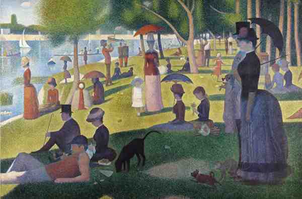 是点彩画新印象主义代表画家乔治·修拉创作的一幅布面油画,该画于1886年展出,现收藏于美国芝加哥美术学院。这幅画主要采用了点彩画法,画家使用了垂直线和水平线的几何分割关系和色彩分割关系,描绘了人们在塞纳河阿尼埃的大碗岛上休息度假的情景,画面宁静而和谐。该画是修拉最著名的画作,被公认为新印象派画作的代表作。