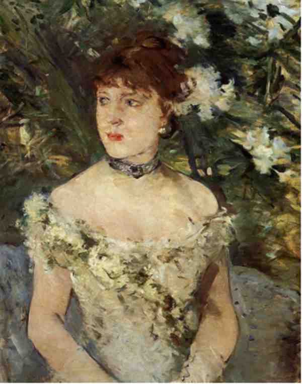 是莫里索在1897年创作的世界印象派油画名作,现收藏于巴黎奥赛博物馆。这幅画描绘的是一位妙龄女郎的半身像,画家以细腻的笔触记录了光照中的人物形象,她的衣服富有质感,肌肤在花丛背景的映衬下显得更加白皙。画面中的人物和背景色调和谐,银灰的色调产生朦胧的视觉效果,透露着某种捉摸不定和虚幻。