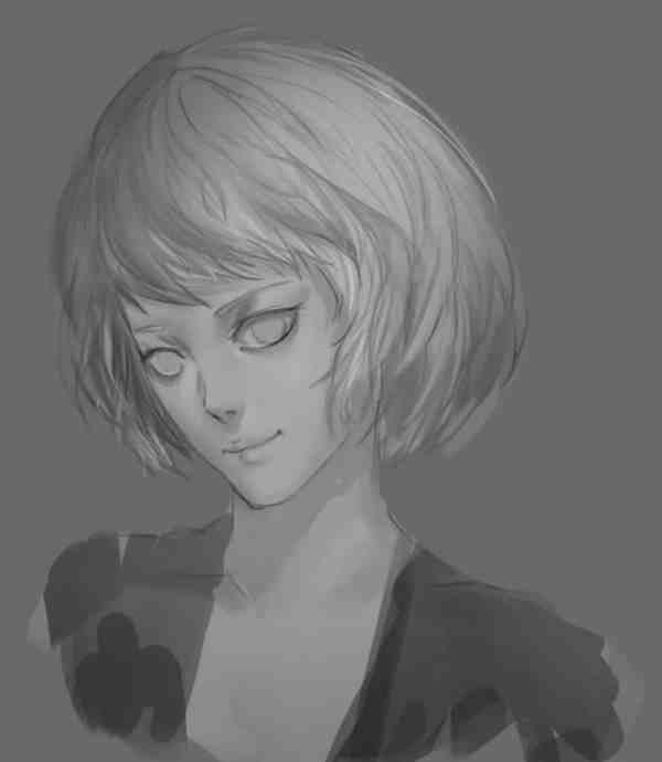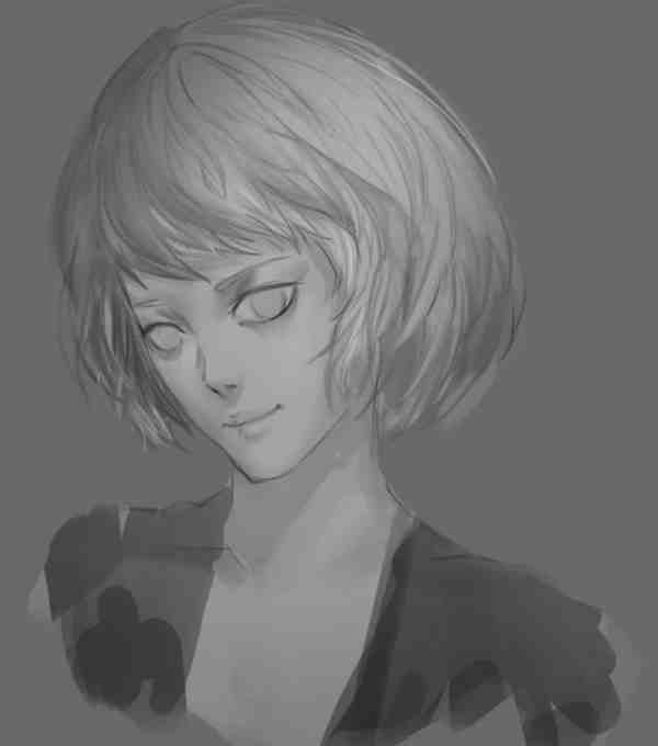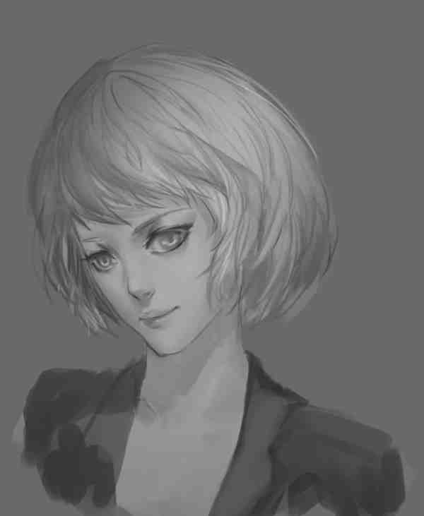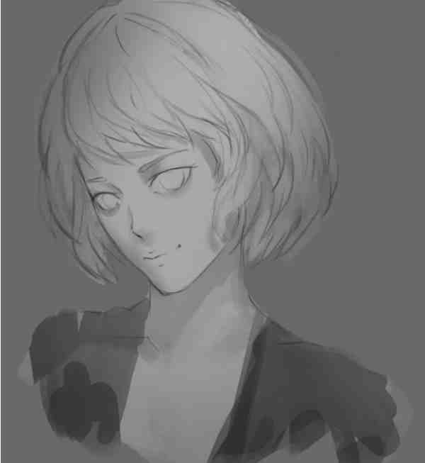 黑白稿最后的部分,(其实就是把之前说漏的说一下)眼睛的瞳孔部分不要画成圆形的顶在眼皮之间,可以把瞳孔的四分之三漏出来,然后瞳仁的部分不要点成一个圆点,然后眼白和瞳孔的暗部统一在一起,过度均衡一下,可以按之前说的方法(新建一层,然后涂然后擦,调整透明度再合并)