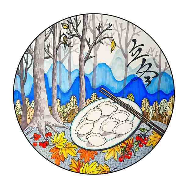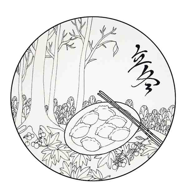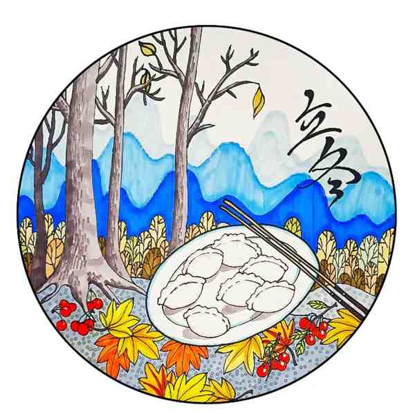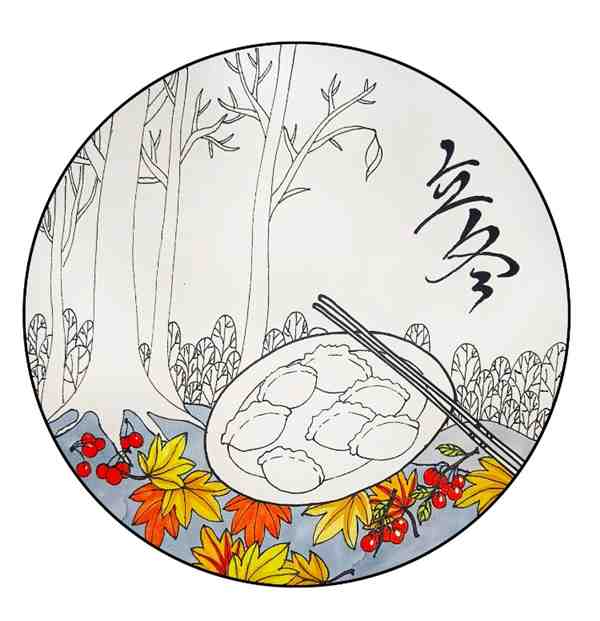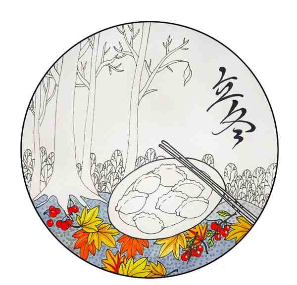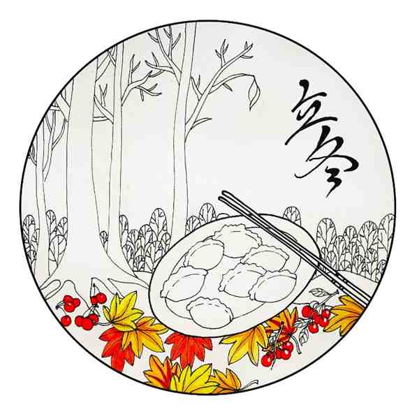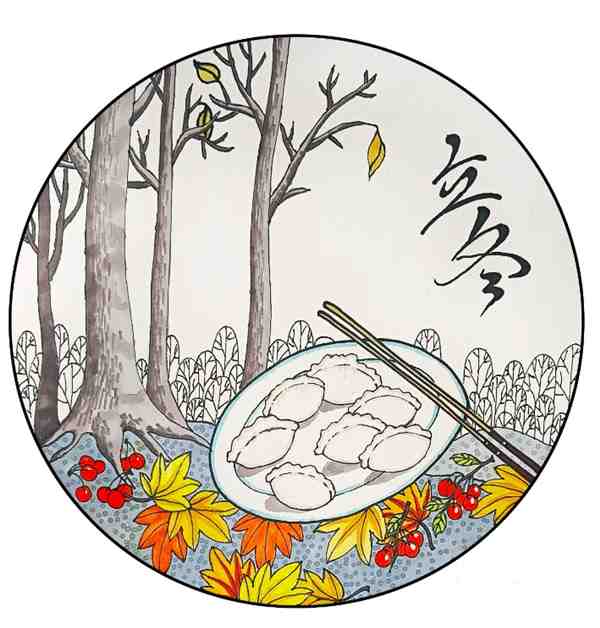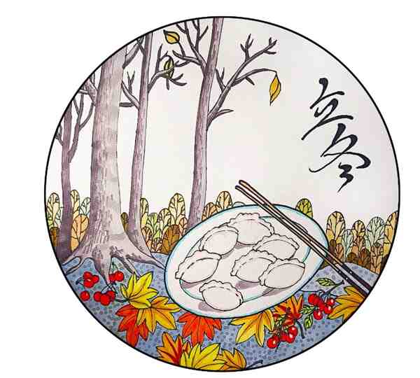 第一步:根据立冬节气素材进行创作,立冬是冬日的开始,树叶飘零,草丛枯黄,以此为背景,节日里吃水饺,可以画出一盘水饺,右边写出“立冬”二字,字体可随意。