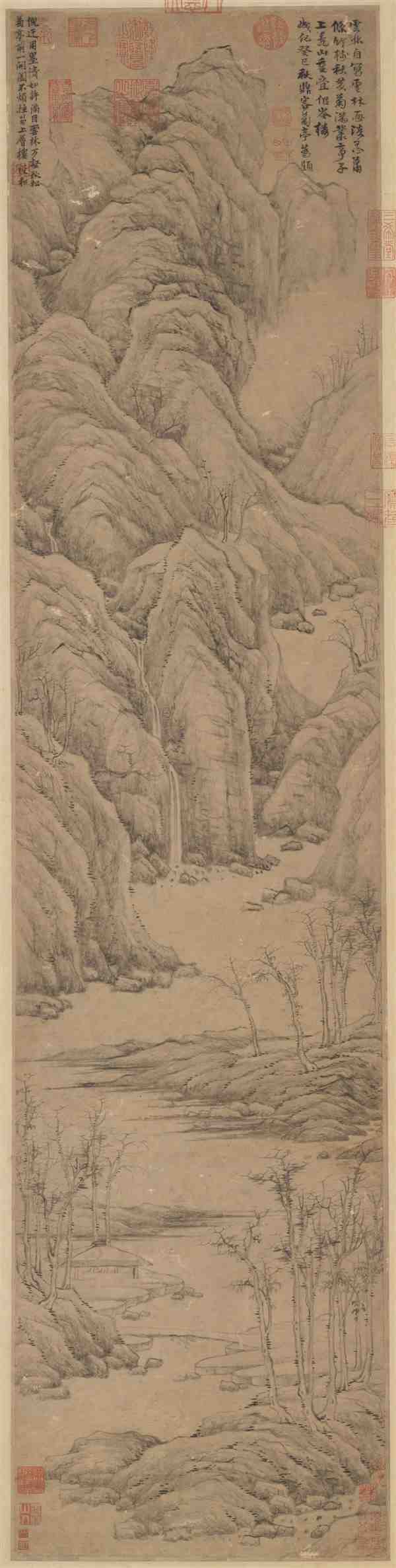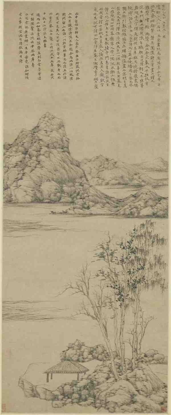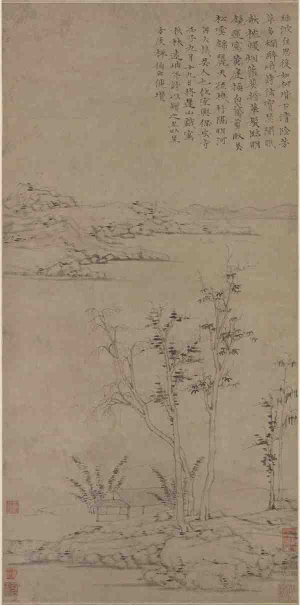 《渔庄秋霁图》:此图画面简洁,近景为临江坡岸,上有杂树数株,中景是一湾止水,风平浪静,远处是一带远山,用干笔皴擦而成。整幅画面没有生气,竹中无飞鸟,水中无游船,山上不见绿痕,笔法幽微。