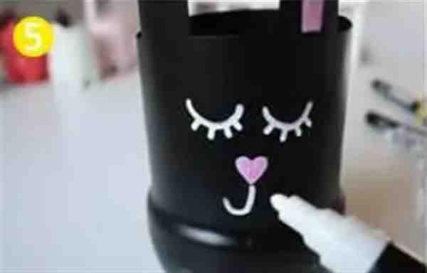 用颜料把饮料瓶整个上色,如果是做的熊猫笔筒就全部先涂黑,再画别的颜色,以此类推。