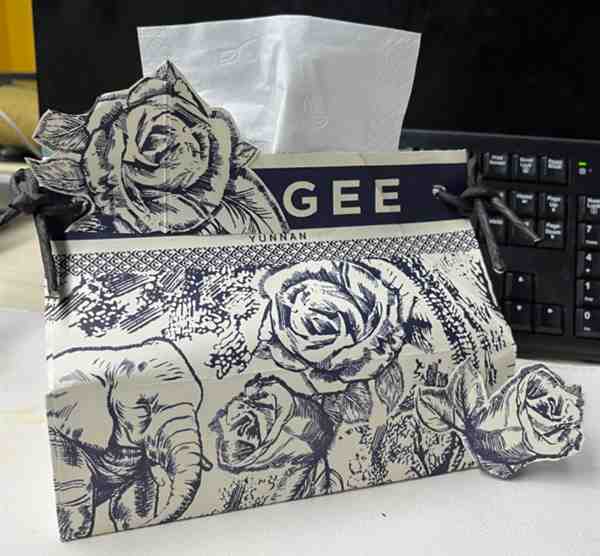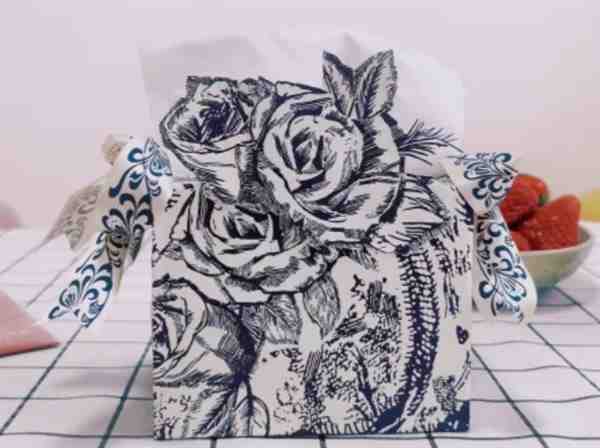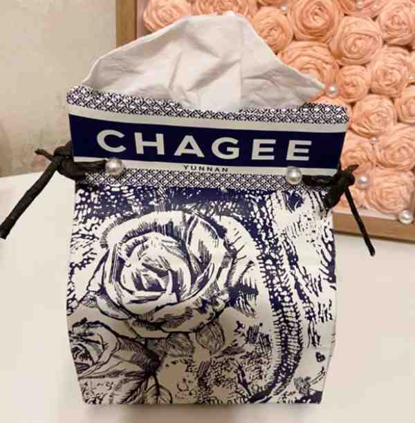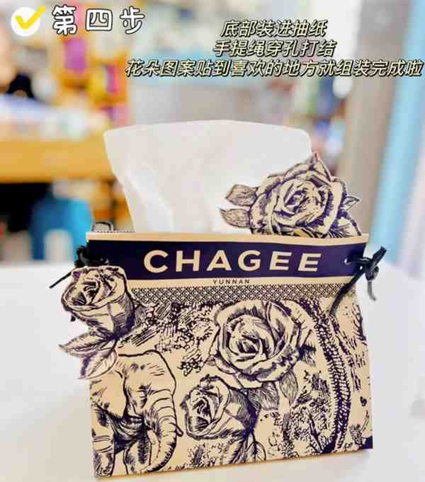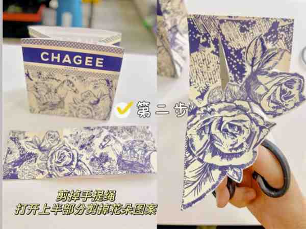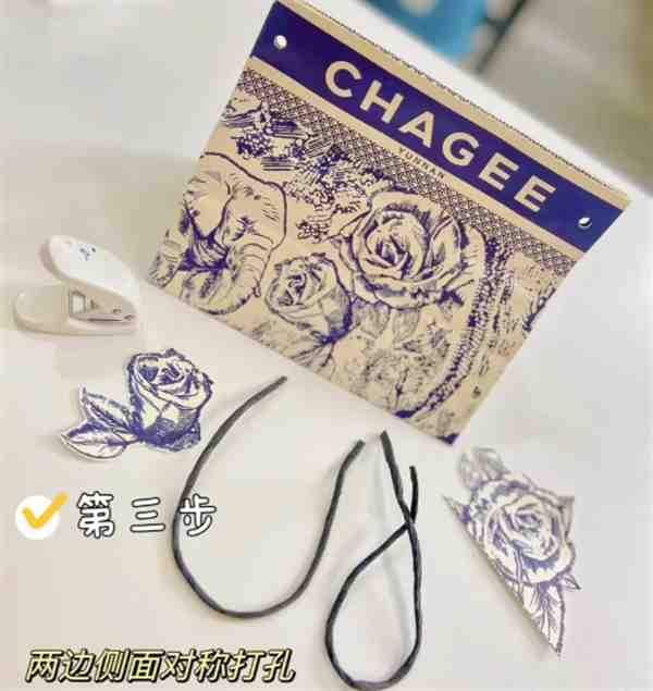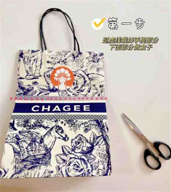 所需材料:霸王茶姬袋子、剪刀、双面胶、回形针