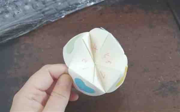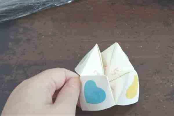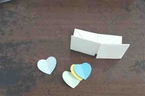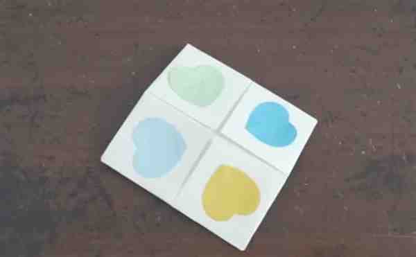 我们用其他颜色的彩纸,剪出四个心形来,用胶水把它们黏在折好的折纸上。