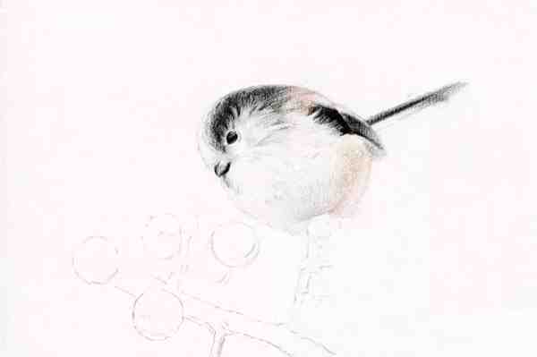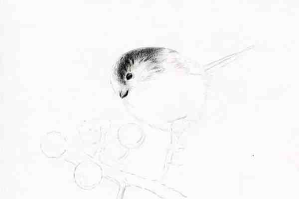 将鸟的头部、嘴巴和眼睛的暗部刻画出来;并且要留意笔触应该根据小鸟形体的方向画。