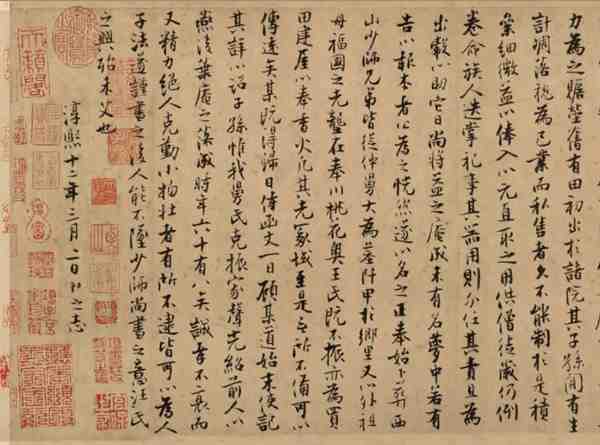 张即之的《汪氏报本庵记》是一篇重要的书法作品,该作品又被称为《书楼钥汪氏报本庵记》,行楷书,纸本墨迹,藏于辽宁省博物馆。此卷纵29.3厘米,横91.4厘米,共有小字行书38行,凡688字。帖后有文徵明的跋文和项元汴的题记。卷前后还有项氏诸印和卞永誉式古堂印,以及清乾隆、嘉庆、宣统三朝的印玺。下面一起来欣赏精选张即之汪氏报本庵记高清大全吧。