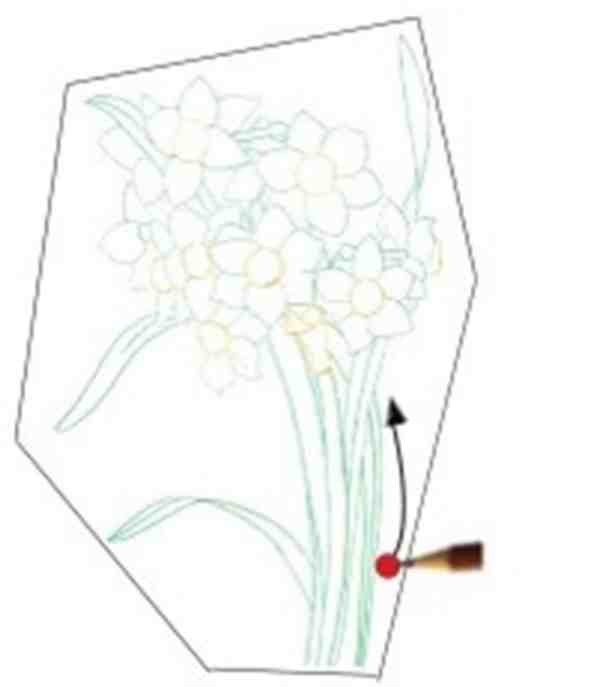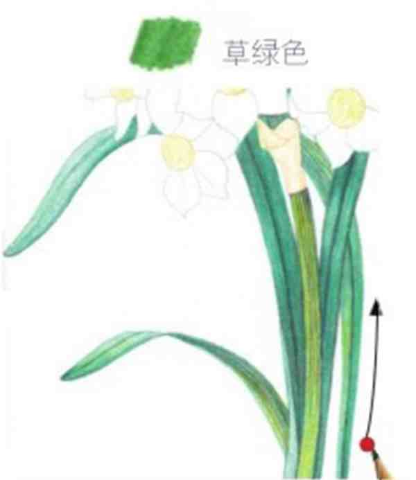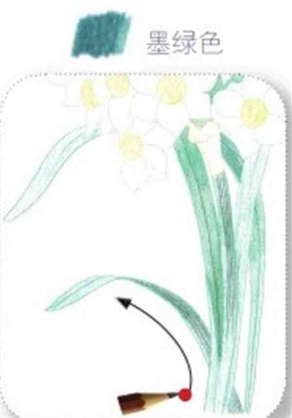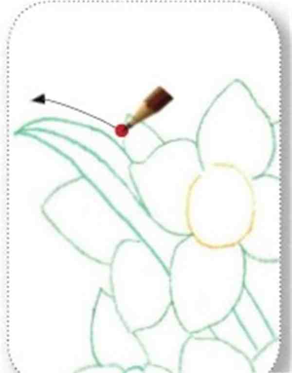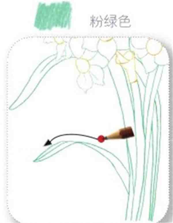 (3)确定形体的外形后,用粉绿色的铅笔勾画出水仙的茎和叶,可以用长线条来表现。