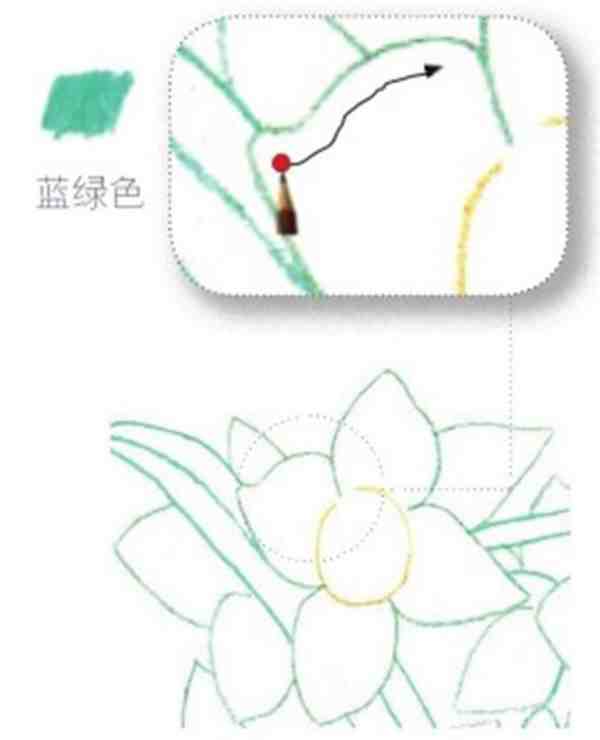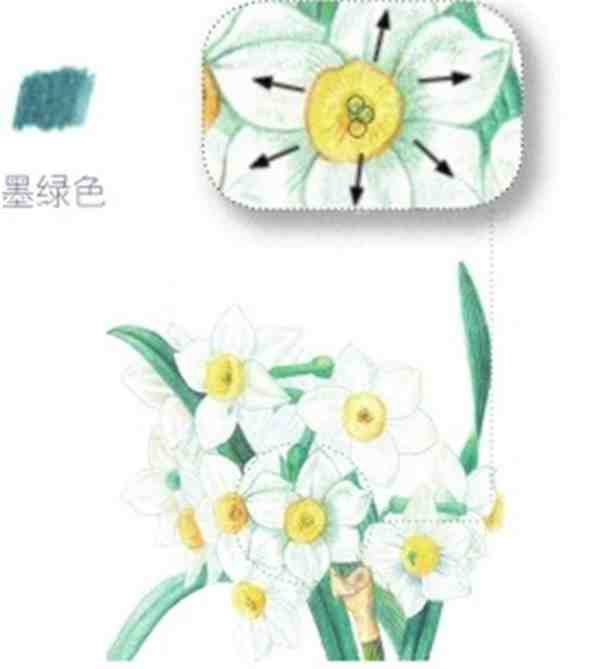 (1)用粉绿色的铅笔在纸上绘制出水仙中间部分的花朵。