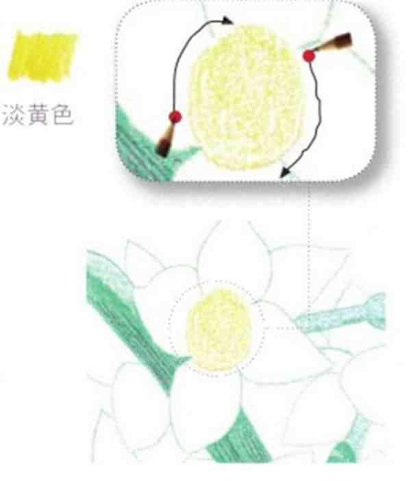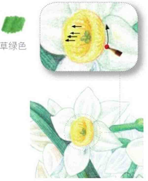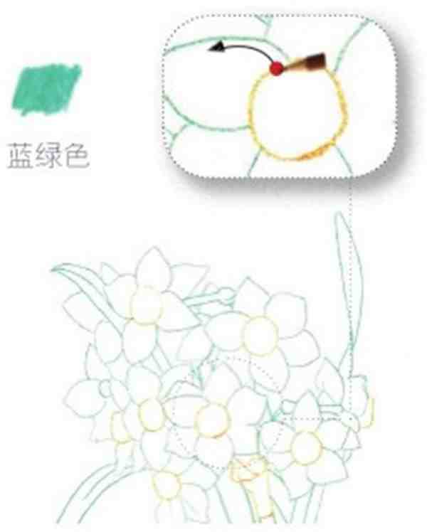 (2)接着用淡黄色的铅笔把水仙花朵中间的花蕊涂抹出来。