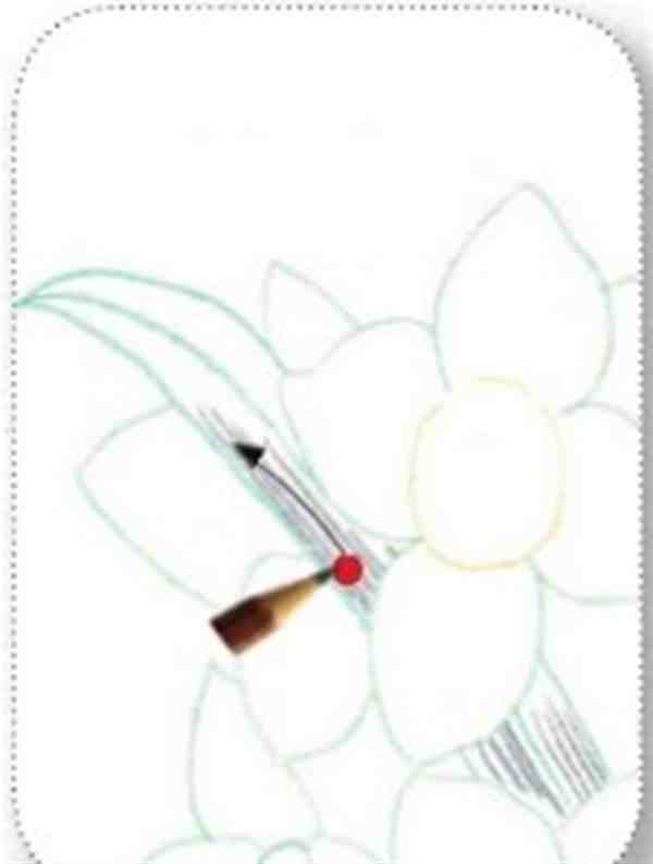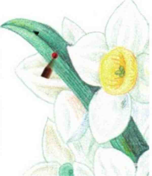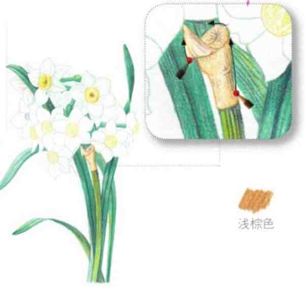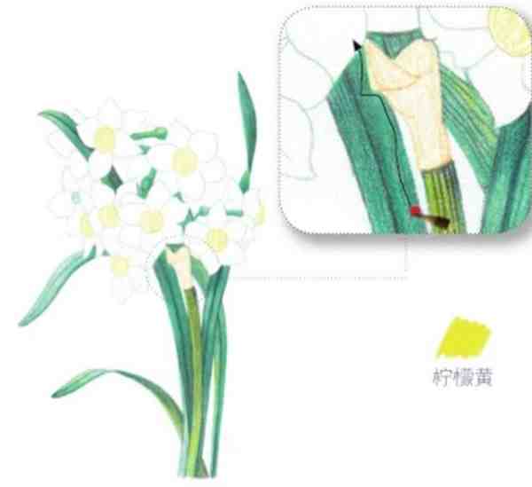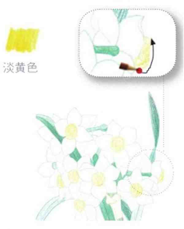 (5)用淡黄色的铅笔涂抹水仙花蕊的颜色,注意不要越过轮廓线。