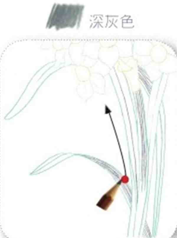 (2)用深灰色铅笔对水仙叶子暗部进行上色