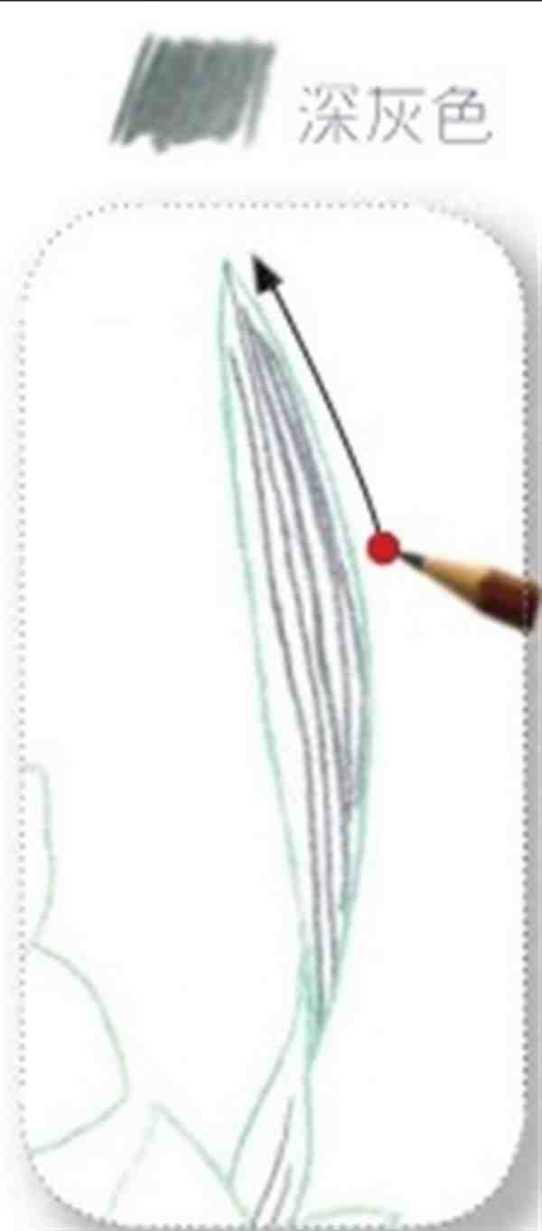 (6)按照叶片向上的走向,用深灰色的铅笔勾画叶子暗部。