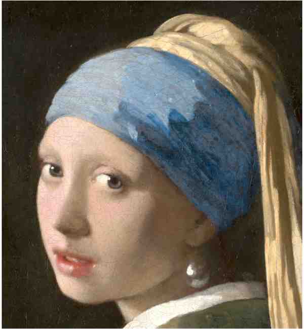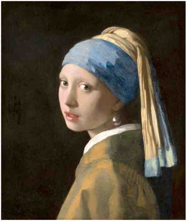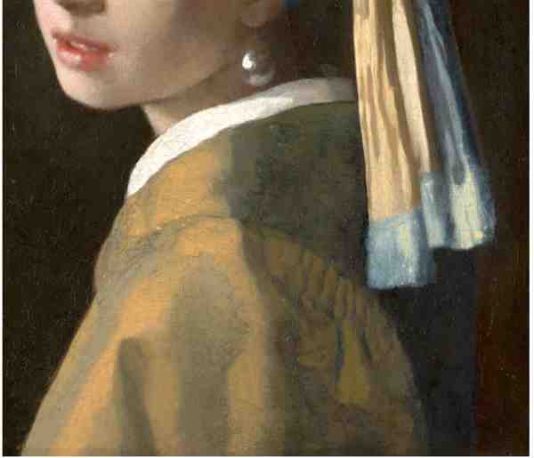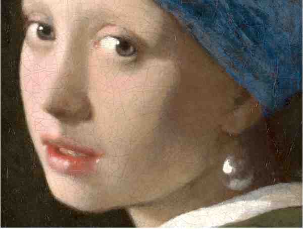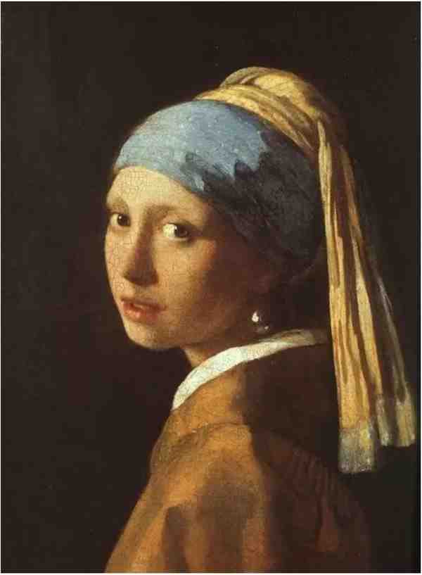 闪烁着光芒的珍珠耳环将少女的双眸、嘴唇、白色的衬衣领口、耳后的黑暗空间等分散区域巧妙地结合在一起,构成了一个鲜活的整体。