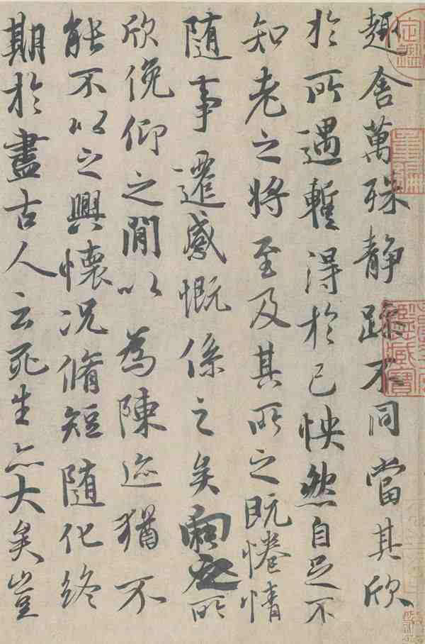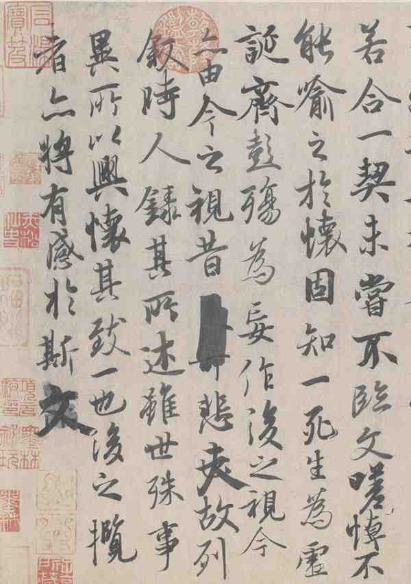 2、具有篆隶用笔习惯。王羲之在书写时速度迟涩,所有的转折几乎都接近于平动使转,没有转折,曲线较多,几乎没有提按、顿挫。