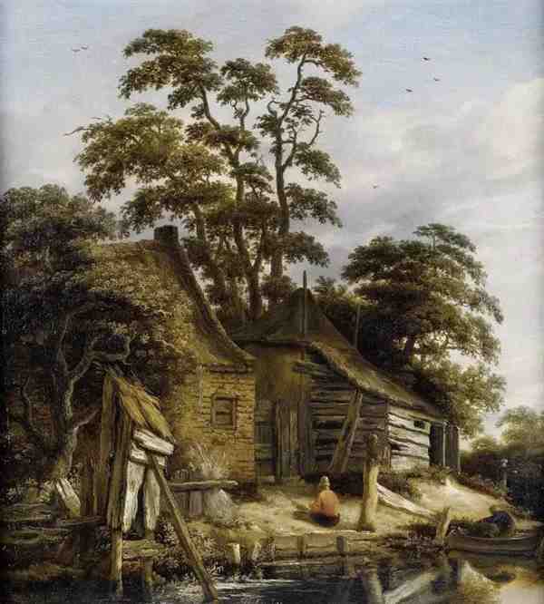 这幅画中的构图极为精妙,一点透视的技法使得画面层次丰富,空间感强烈。大比例的天空仿佛是对鲁伊斯达尔风格的深情回忆,那宽广无垠的蓝,如同画家内心的宁静与深沉。而画面中瘦骨嶙嶙的荷兰赤杨,更像是在诉说着霍贝玛晚年那苍凉而孤寂的心境。