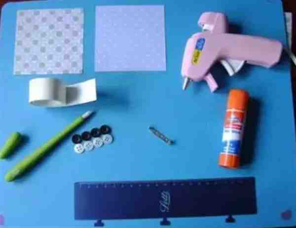 其次,工具有剪刀,大头钉,胶棒,竹签,材料都是生活中常见的东西。下面我们开始吧,将纸对折。