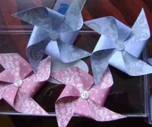 接下来,在彩纸的中心我们可以用强力胶水粘上一颗纽扣,或者一朵塑料花朵都可以,风车背面也要装饰。