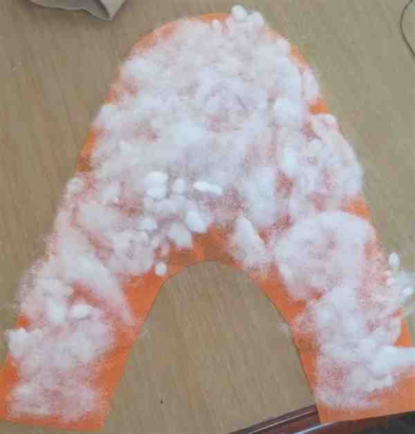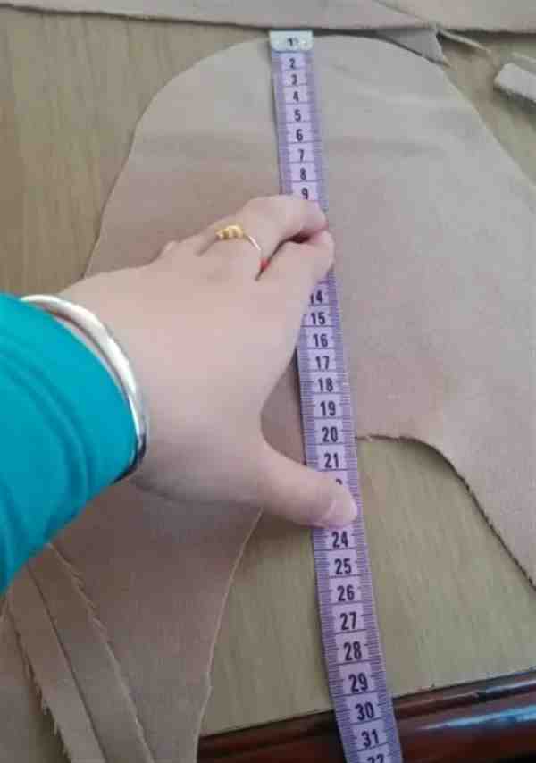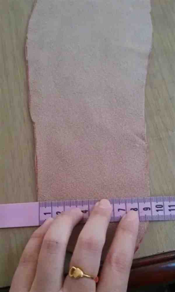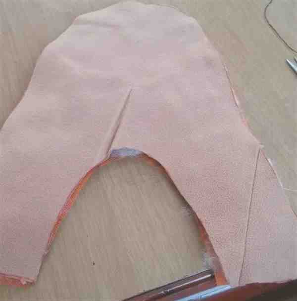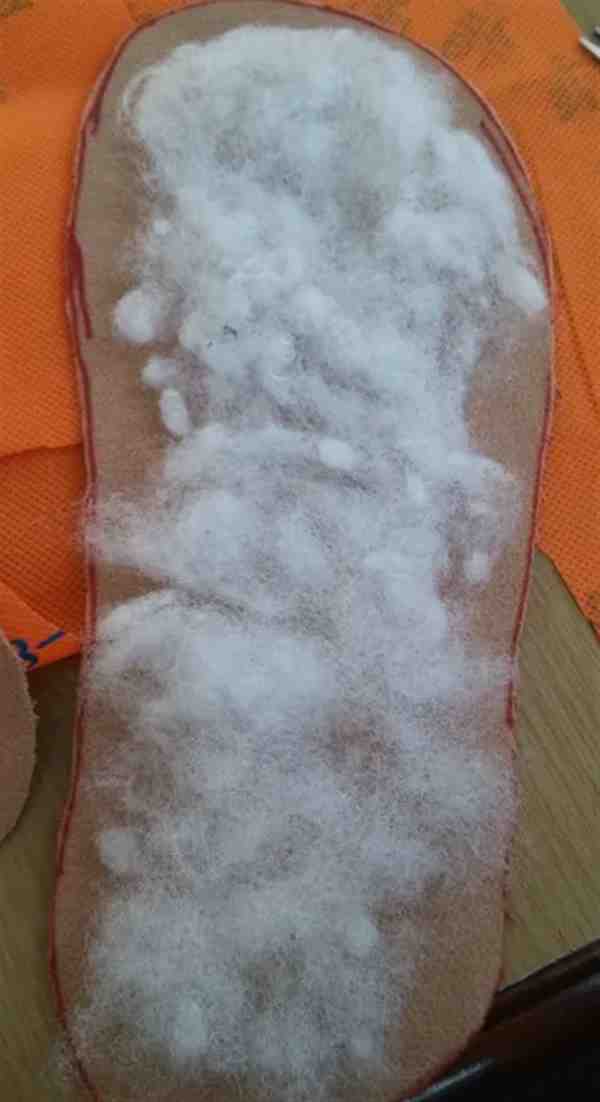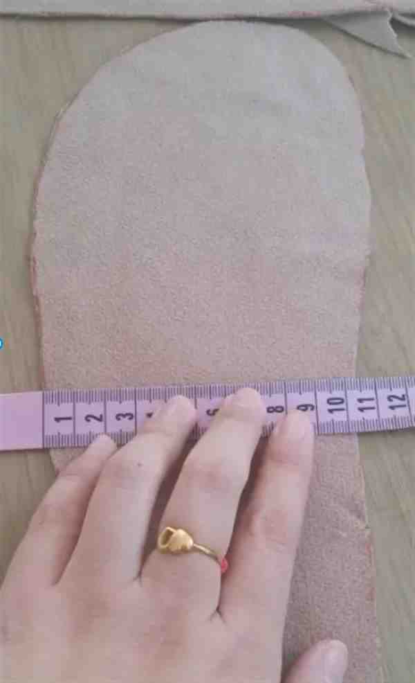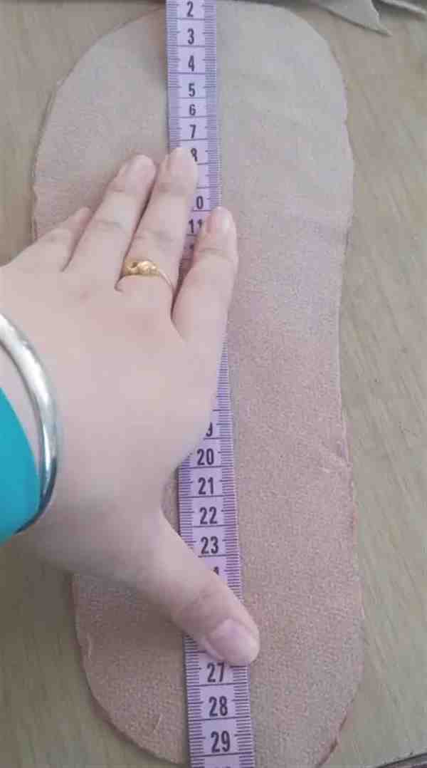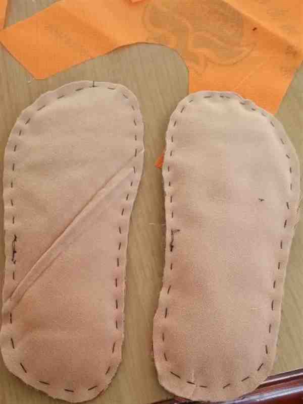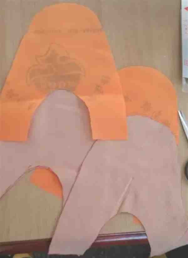 2.先做鞋底,比着拖鞋的底子在大衣上画上线,然后剪下来。左右脚各两个。
