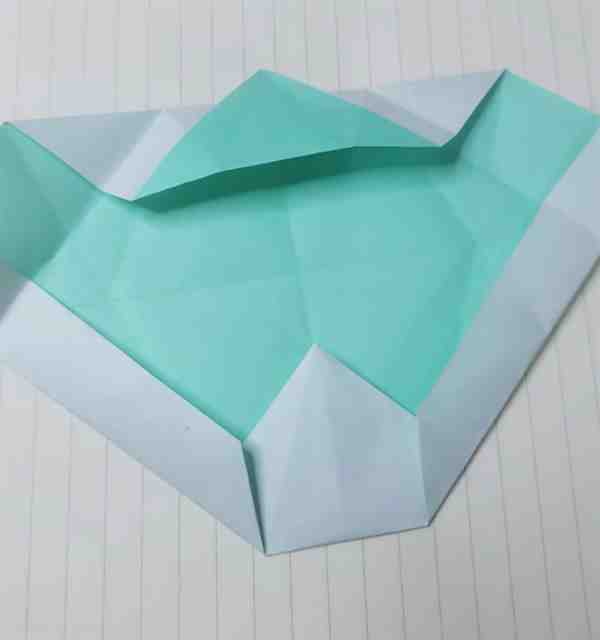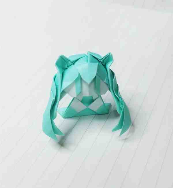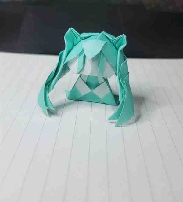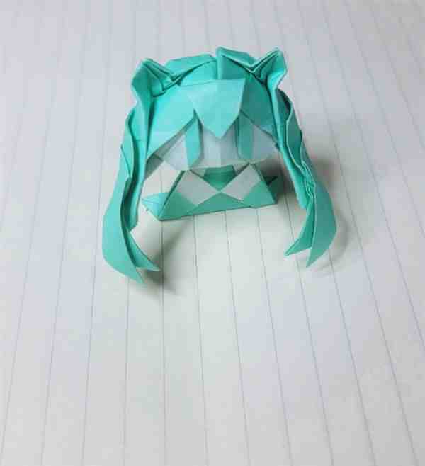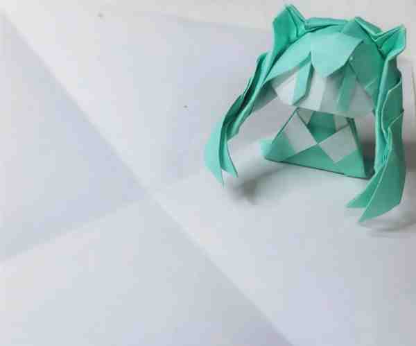 Step 5.根据折痕,将三角形向上折起,形成初音未来的脸。