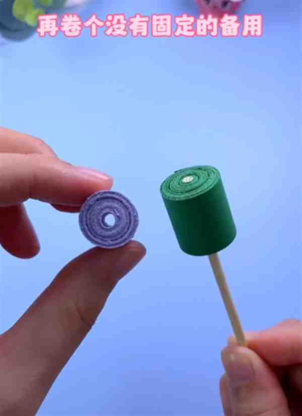 2、制作轴承部分,首先剪两条宽度约1~2厘米的纸条,然后分别卷在细木棍上,逐渐卷至适宜厚度。其中一个纸卷需固定在木棍底部,另一个可滑动。