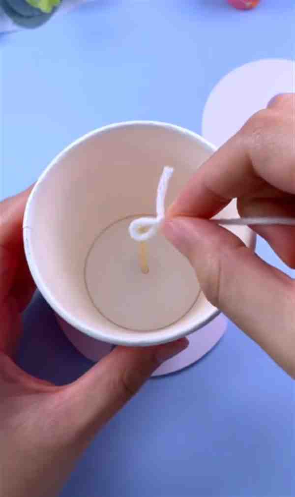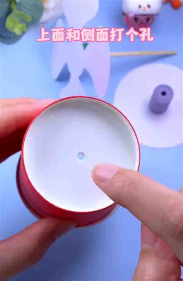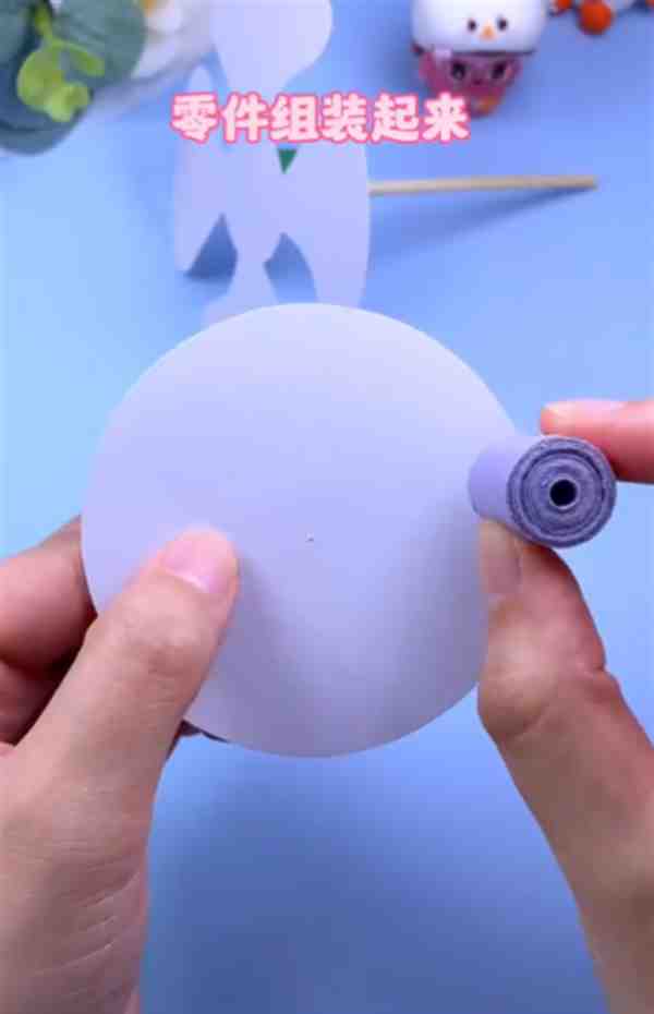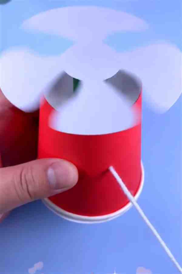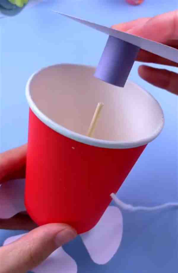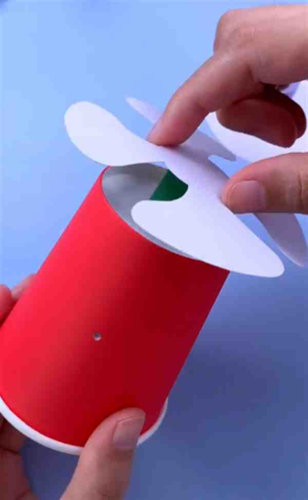 4、进行组装将活动轴承粘在圆形纸的中心,固定轴承粘在扇叶上。将木棍从顶部插入纸杯中,同时将绳子从侧面穿入纸杯并系在木棍上。将圆形纸放置在纸杯口部,确保木棍末端能顺利插入轴承中,从而固定圆形纸与纸杯主体。