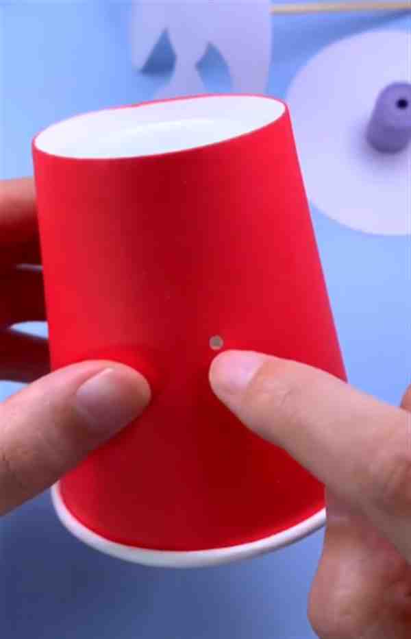 3、取一个纸杯作为主体,分别在纸杯的中心点和侧面1/2处打孔,孔径应足够小,以便绳子穿过。同时,用纸杯在卡纸上绘制一个与杯口大小相近的圆形,并剪下。