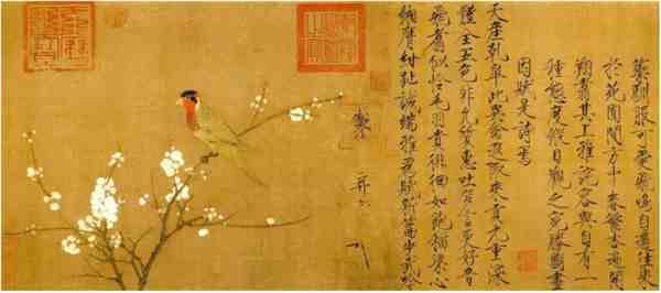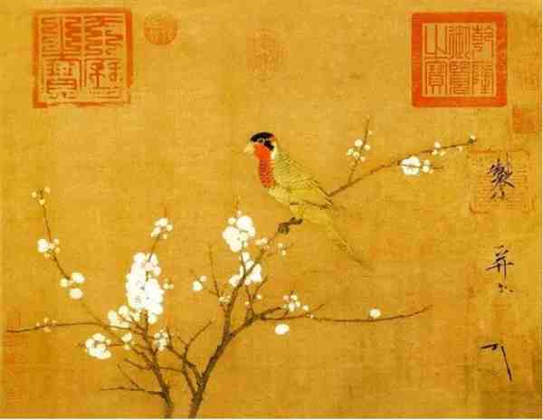 宋徽宗最擅长写生书法,图绘折枝杏花两枝,枝头栖五色鹦鹉一只,用笔细劲工致,设色浓丽,精心描绘鹦鹉的侧身英姿,栖止于盛开的杏花枝头,显得心满意足,无忧无虑。画上钤有元文宗“天历之宝”印,清戴明说、宋荦藏印及清乾隆、嘉庆内府鉴藏印,《石渠宝笈初编》著录。赵佶这幅《五色鹦鹉图》在宋徽宗的作品中是数一数二的代表作。