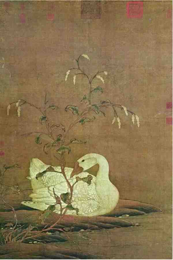 红蓼一枝离坡高起,画折叶反正,翻折得势,用粉染瓴,笔意精工之至。白鹅静卧岸边,引颈回眸,造型上健壮肥硕,全画面无论白鹅、蓼花的枝干、叶均用细线双钩、坡岸、水纹钩皴与之笔韵一致,且用淡墨汁绿等层层渲染,精工而丰富,整幅画面意境清旷,幽远辽阔,一派深秋的肃杀气氛,借单纯的物象传出,充分说明这是一张言简意赅的传神妙品。