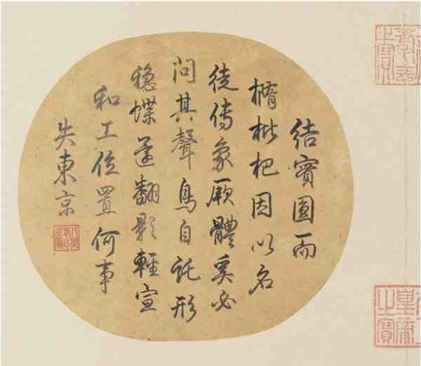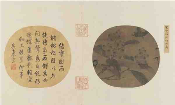 本幅款押“天下一人”。钤“御书”朱文葫芦形印一方。裱边题签:“宋宣和枇杷山鸟”。鉴藏印钤“宣统御览之宝”,中缝钤“八征耄念之宝”、“ 太上皇帝之宝”朱文印各一方。
