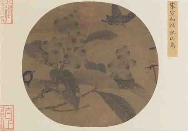 图中枇杷果实累累,枝叶繁盛。一山雀栖于枝上,翘首回望翩翩凤蝶,神情生动。此图体现崔白清澹之体。宋徽宗赵佶的花鸟画以设色为多,然而此图纯以水墨勾染而成,格调高雅,略似没骨画效果,别具一种苍劲细腻之韵致,体现了赵佶多方面的绘画才能。