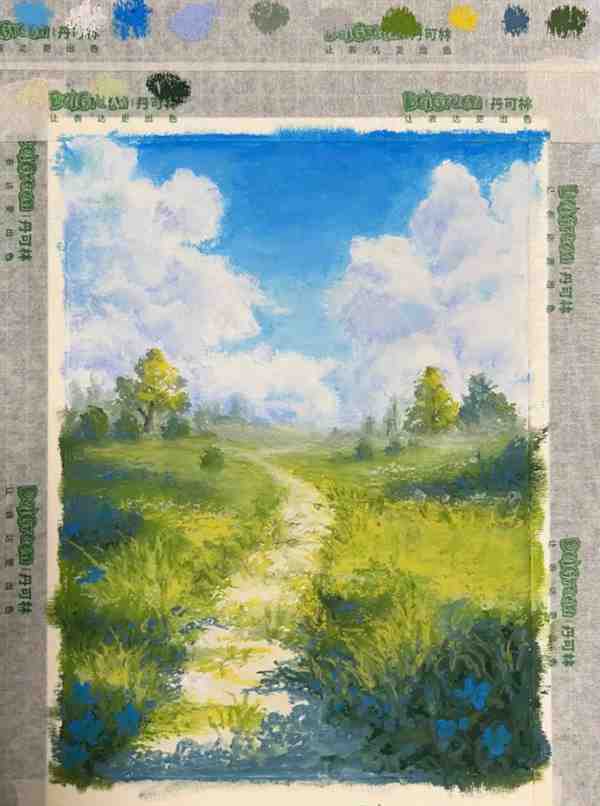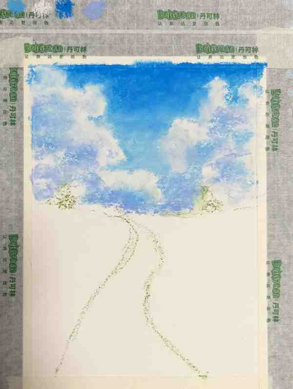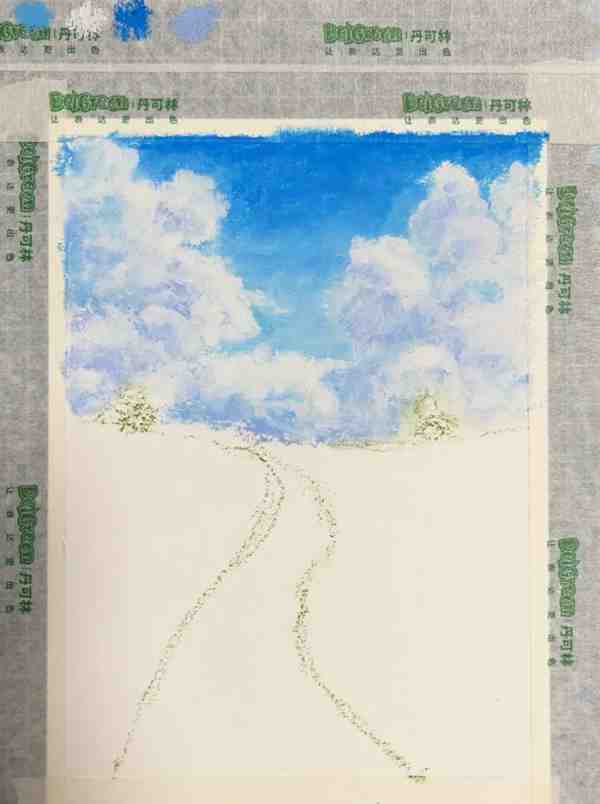 步骤9.添加天空:用蓝色或渐变色的油画棒在画纸的上方画出天空,可以加入一些白云的细节。
