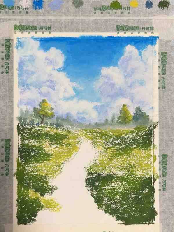 步骤4.绘制草地:在小路两侧用绿色油画棒画出草地,注意颜色的深浅变化和过渡。