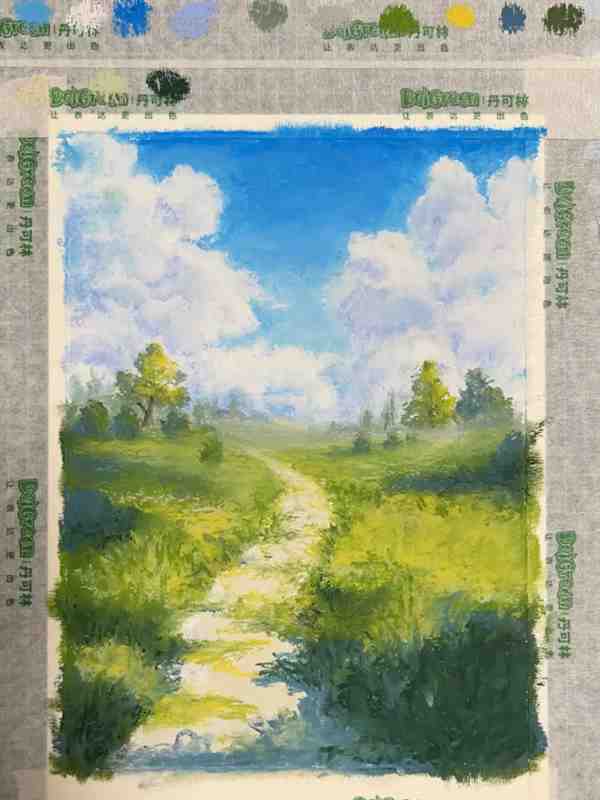 步骤3.填充小路:用同色系的油画棒填充小路的颜色,可以稍微添加一些阴影来增强立体感。