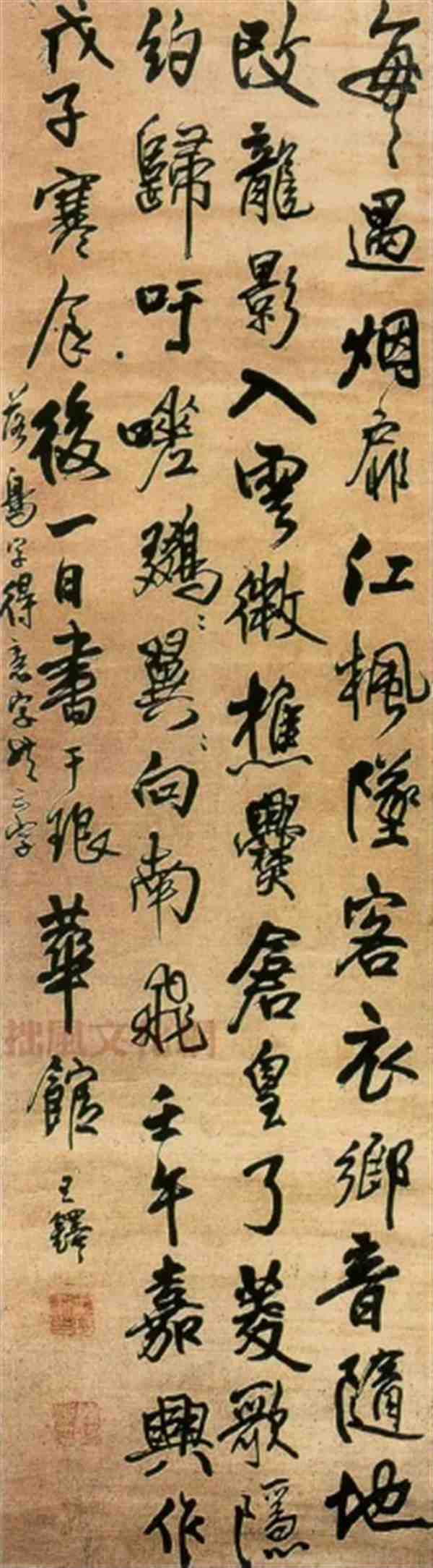 王铎(1592—1652年),字觉斯、觉之,号十樵、嵩樵,又号痴庵、痴仙道人,别署烟潭渔叟,河南孟津人。明末清初大臣、书画家。他的书法与董其昌齐名,有“南董北王”之称。王铎的书法作品有《拟山园帖》和《琅华馆帖》等,其绘画作品有《雪景竹石图》等。