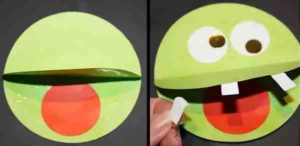 剪一个红色圆形卡纸做大嘴怪的舌头,白色长方形卡纸做牙齿~