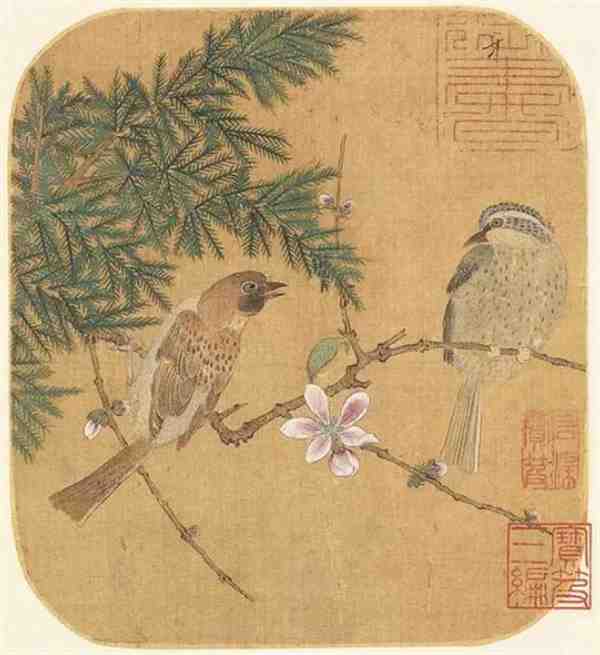 其次,赵佶的花鸟画构图洗练,善于取自然景观一角,通过删繁就简的手法突出主题。在枝叶的穿插疏密上,他展现出了充分的节奏感和舒卷自如的境界。同时,他擅长通过鸟雀视线的穿透和交织来烘托主题,使得所绘鸟雀之间具有相互呼应的趣味。