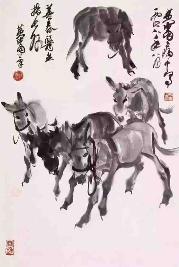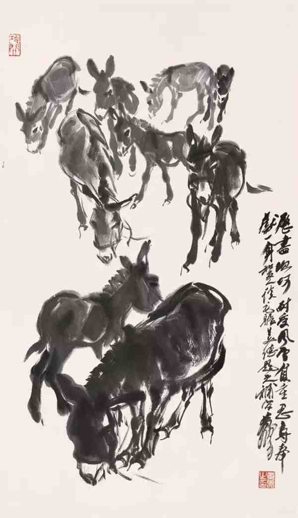 黄胄的驴画不仅在形态上栩栩如生,更重要的是他能够通过笔墨表现出驴的神态和性格。他深入观察驴的动态和特征,通过细致入微的笔触,将驴的灵动、温顺、活泼等性格特点表现得淋漓尽致。他的驴画不仅是一种艺术表现,更是对生命和自然的敬畏与感悟。