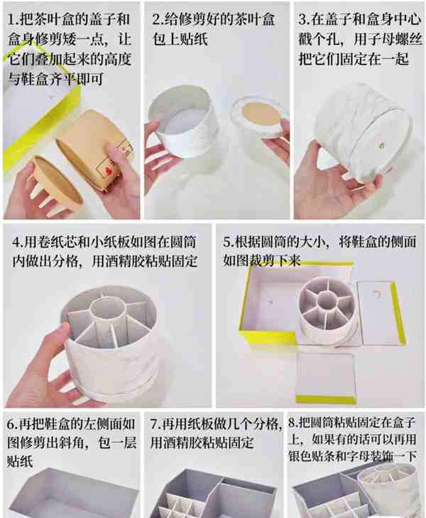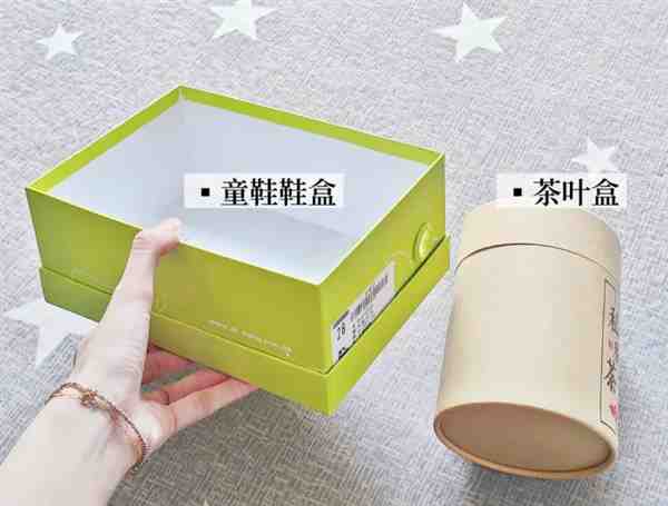 Step 1.把茶叶盒的盖子和盒身修剪矮一点,让它们叠加起来的高度与鞋盒齐平即可。