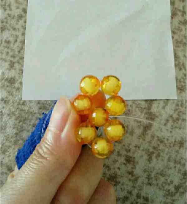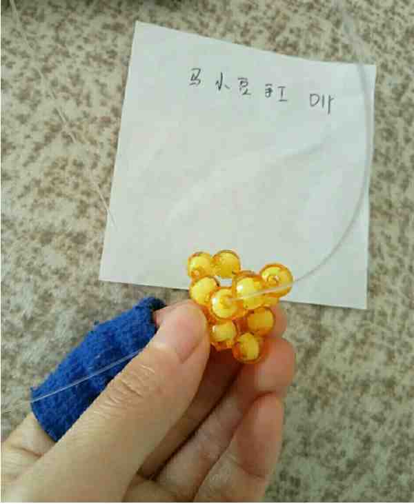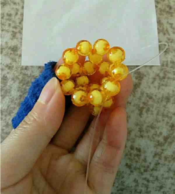 2、左线过二颗珠子右线加三颗黄色珠子回扣左线再加三颗黄色珠子穿过回扣的珠子回到原位。